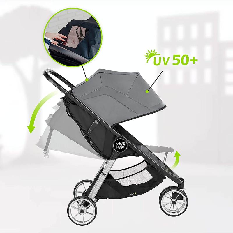 Leggero e maneggevole, chiusura ad una mano, capiente, pedana poggiapiedi rialzabile, cappottina parasole con finestrella.