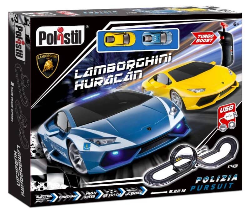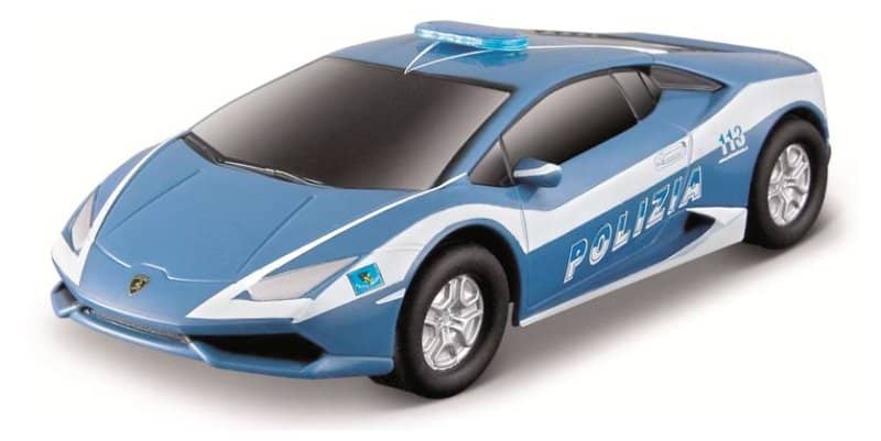 Set con due Lamborghini Huracane in scala 1:43. Divertiti a far sfuggire la Lamborghini e a rincorrerla con quella della polizia!